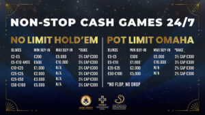 No tournament festival goes without cash games. The poster shows all available limits and other essential information for cash game players.