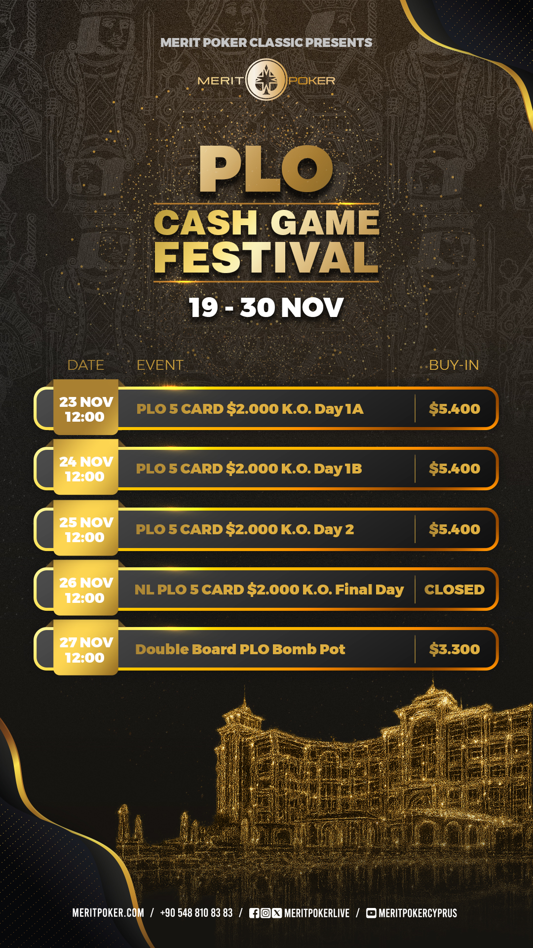 26-Nov | Wednesday | 12:00 | NL PLO 5 CARD $2.000 K.O. Final Day | CLOSED | $500.000 | CLOSED | 60 | CLOSED | |||